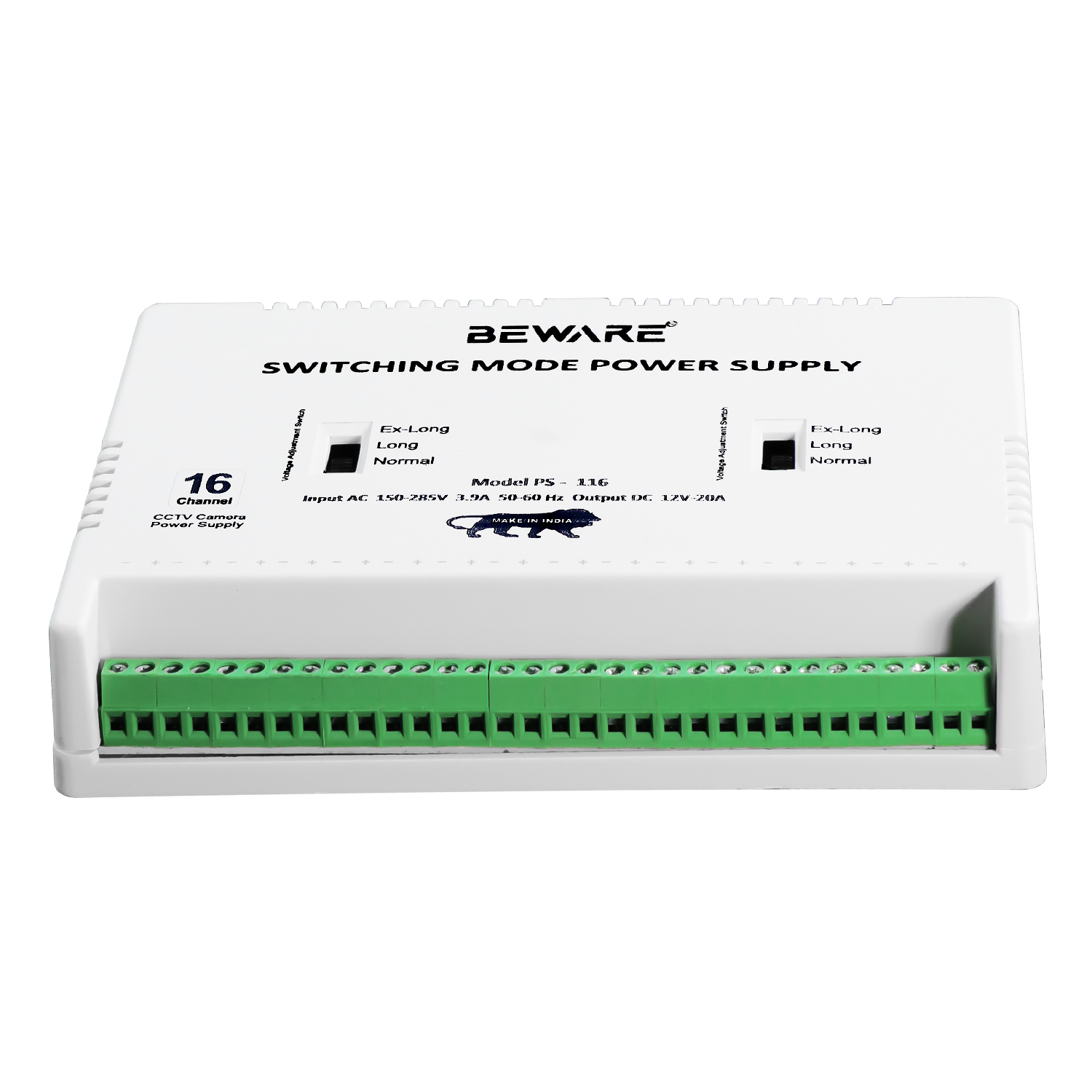 The BEWARE 16CH SMPS – Single Output is a high-capacity power supply unit designed to deliver consistent power for CCTV camera systems. Ideal for large surveillance installations, it ensures reliable operation of multiple cameras from a single power source.