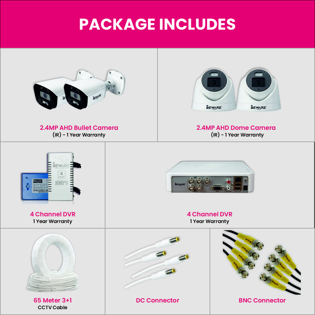 Complete CCTV combo kit with 4 HD cameras, DVR, and all essential accessories for easy installation. Provides clear video with audio support for reliable monitoring. Ideal for home, office, and shop security.